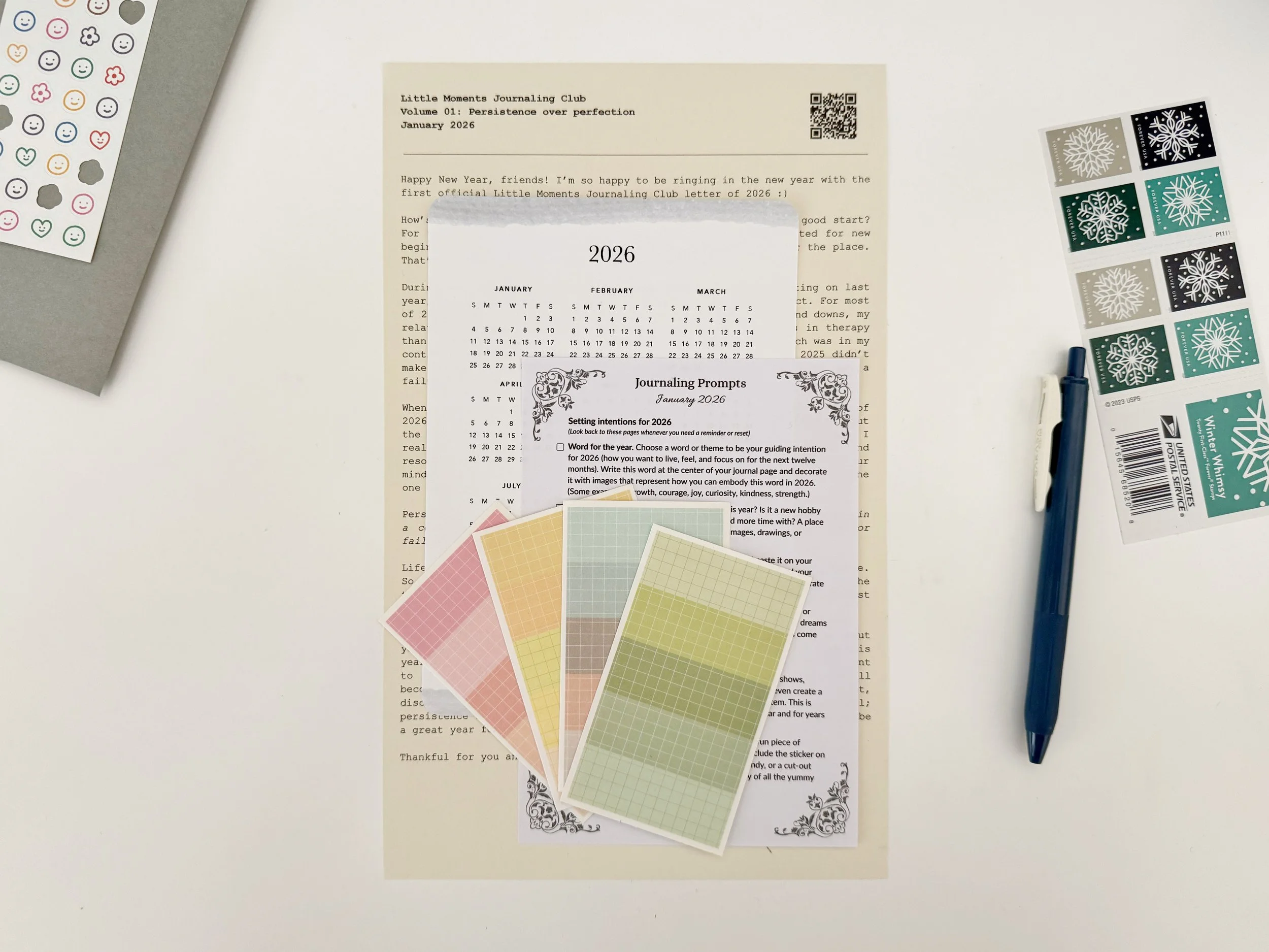 Members also received a sheet of washi-style stickers and a 2026 year-view calendar to help keep track of their journaling.